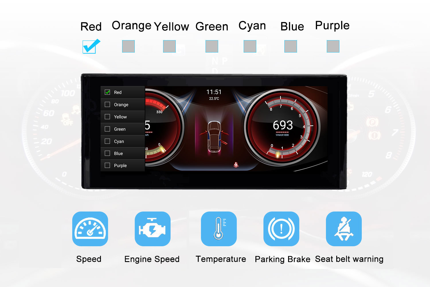 Zeigen Sie Geschwindigkeit, Kraftstoffstand, Öldruck und Sicherheitswarnungen usw. auf dem Android-Bildschirm an.